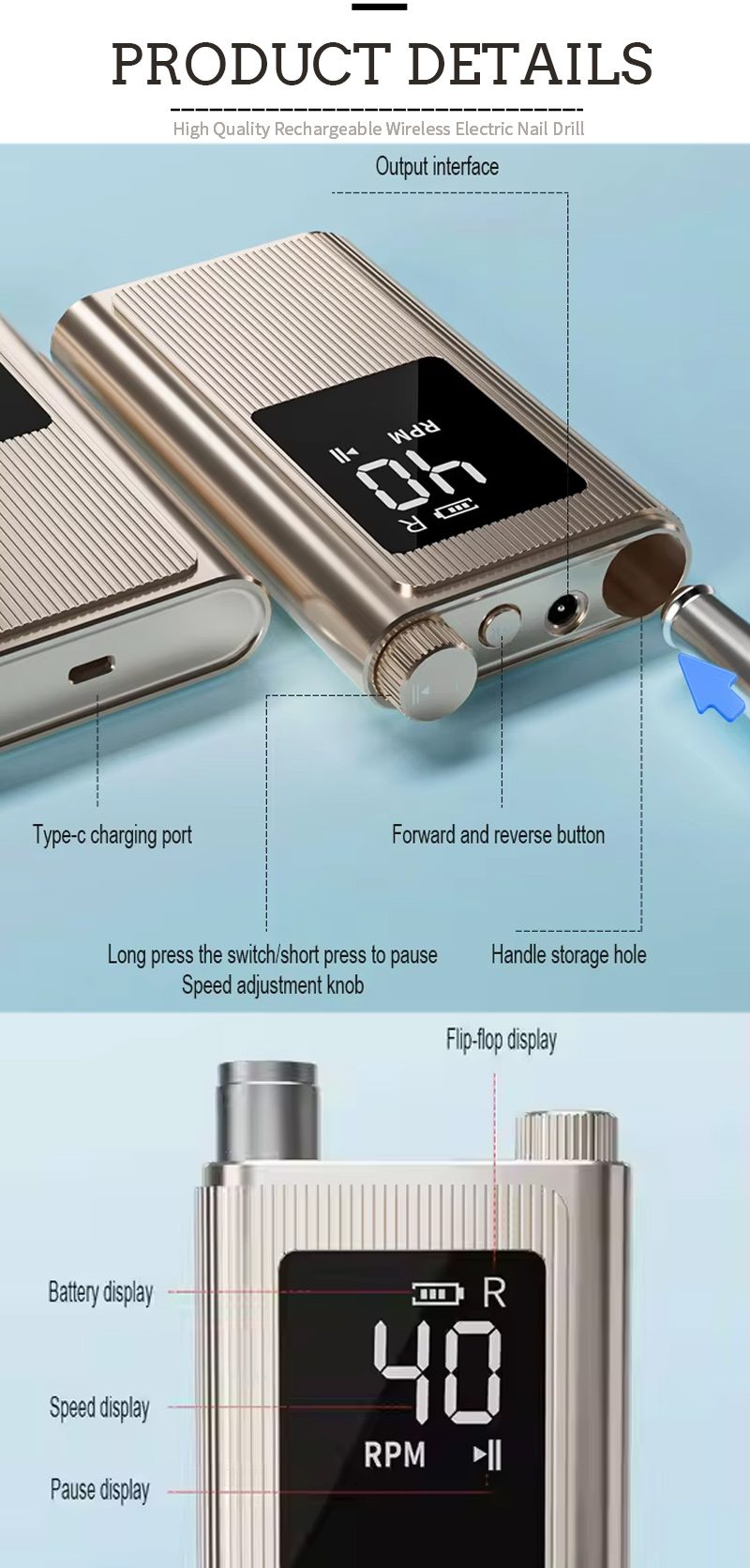 | Επαγγελματικό τρυπάνι νυχιών υψηλής ταχύτητας 40.000 RPM Λεπτομέρειες |