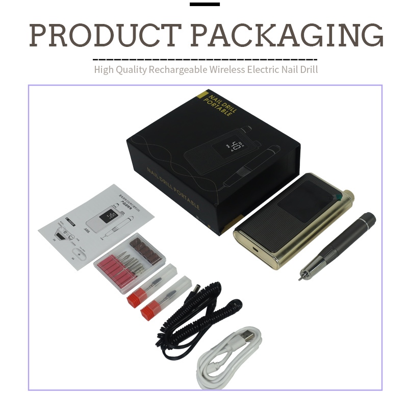 Το περιεχόμενο αυτού του πακέτου επαγγελματικού τρυπανιού νυχιών υψηλής ταχύτητας 40.000 στροφών ανά λεπτό διαθέτει ένα προϊόν στυλό λείανσης, ένα καλώδιο φόρτισης USB, ένα εγχειρίδιο οδηγιών προϊόντος και ένα ελαφρύ και φορητό κουτί.