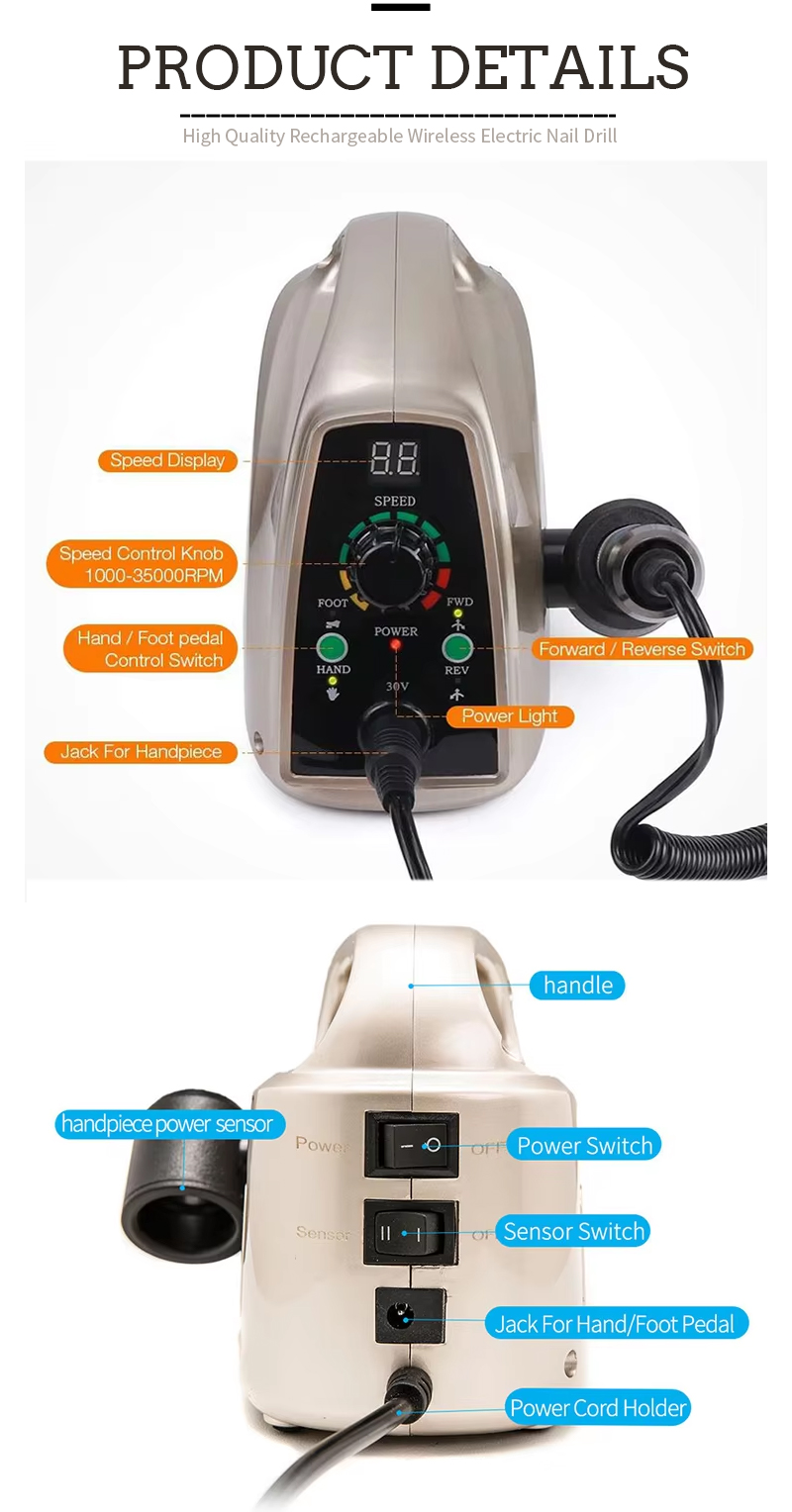 Φορητό Σετ τρυπάνια νυχιών Ηλεκτρικό Με Ισχυρό Μοτέρ 65w 35000rpm