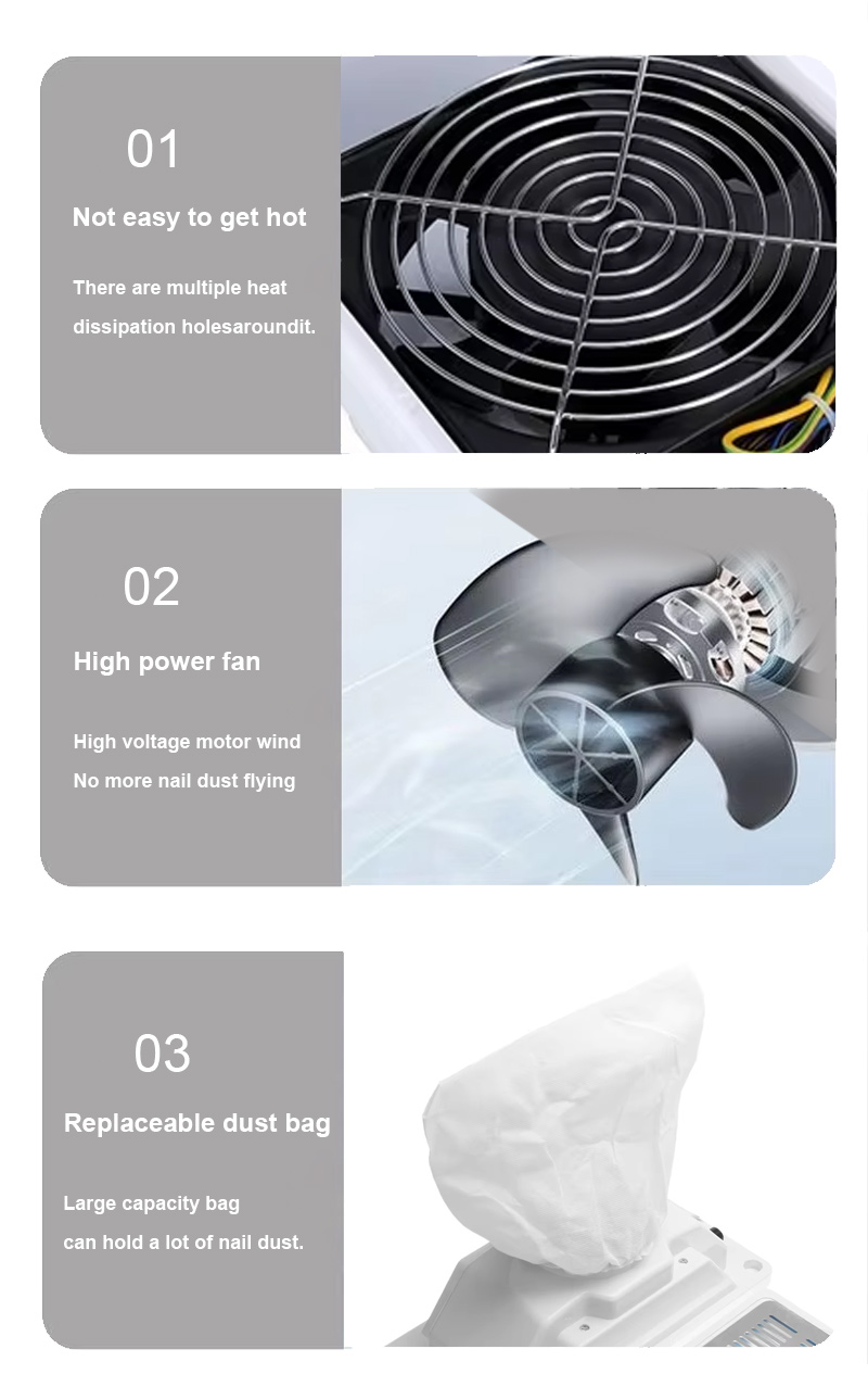 Η ισχυρή απορρόφηση των υπολειμμάτων των νυχιών των προϊόντων δεν διαρρέει σκόνη, διατηρεί τον πάγκο καθαρό και τακτοποιημένο, το γρήγορο σκούπισμα με ηλεκτρική σκούπα δεν διαρρέει σκόνη υψηλής ισχύος πιο αποτελεσματικό.