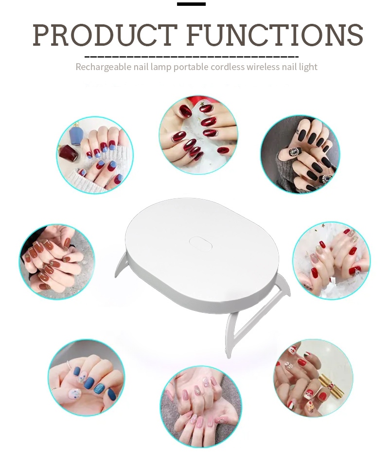 Η αναδιπλούμενη μίνι λάμπα στεγνώματος νυχιών εξασφαλίζει ομοιόμορφο στέγνωμα της κόλλας χωρίς συρρίκνωση. Οι διπλές πηγές φωτός του παρέχουν απαλή θέρμανση για να αποτρέψουν τον αποχρωματισμό των χεριών και την καταπόνηση των ματιών, κατάλληλες τόσο για χέρια όσο και για πόδια, προσφέροντας εξαιρετικά γρήγορα αποτελέσματα στεγνώματος.
