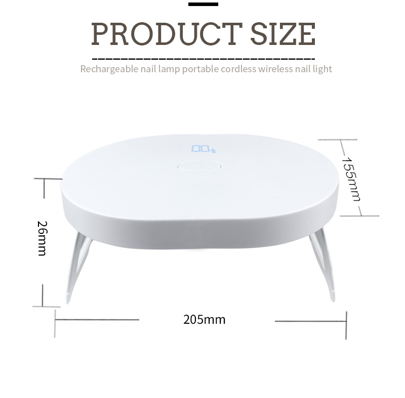 Οι διαστάσεις της αναδιπλούμενης μίνι λάμπας στεγνώματος νυχιών είναι 205 mm σε μήκος, 155 mm σε πλάτος και 26 mm σε ύψος, με μεγάλη χωρητικότητα και δυνατότητα χρήσης και των χεριών και των ποδιών, κάτι που είναι πολύ βολικό.