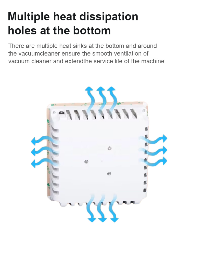 Το κάτω μέρος του προϊόντος έχει οπές ψύξης για ομαλό αερισμό και η ηλεκτρική σκούπα έχει σχεδιαστεί με πολλαπλούς αεραγωγούς ψύξης στο κάτω μέρος και γύρω-γύρω για να εξασφαλίζει ομαλό αερισμό και να παρατείνει τη διάρκεια ζωής του μηχανήματος.