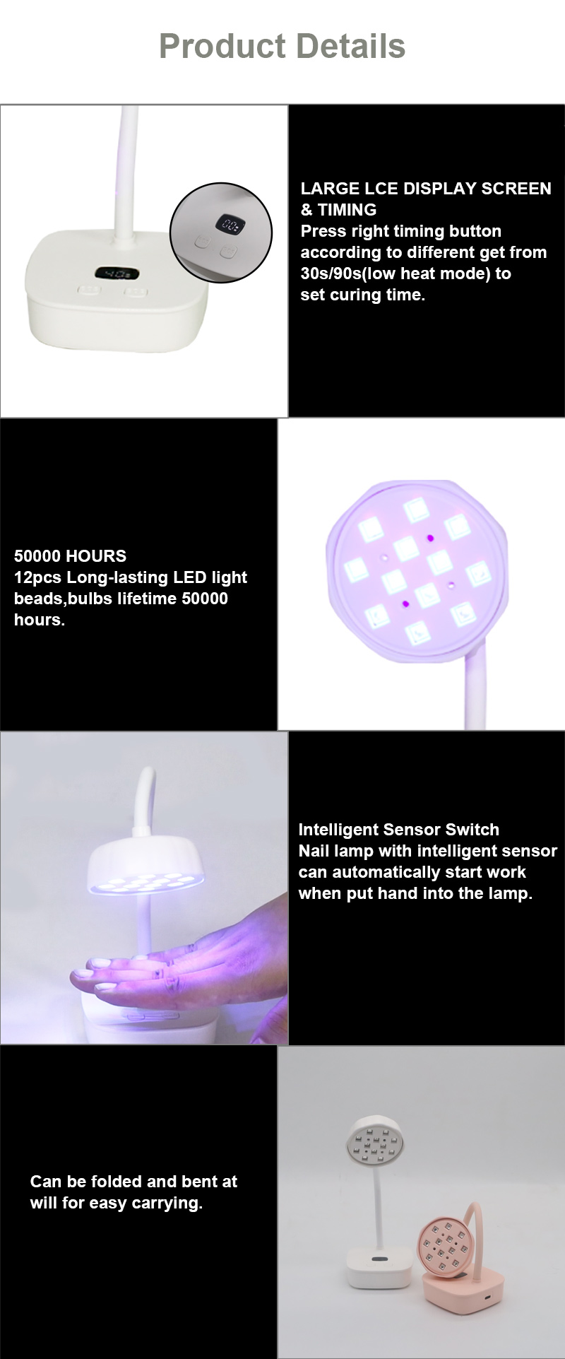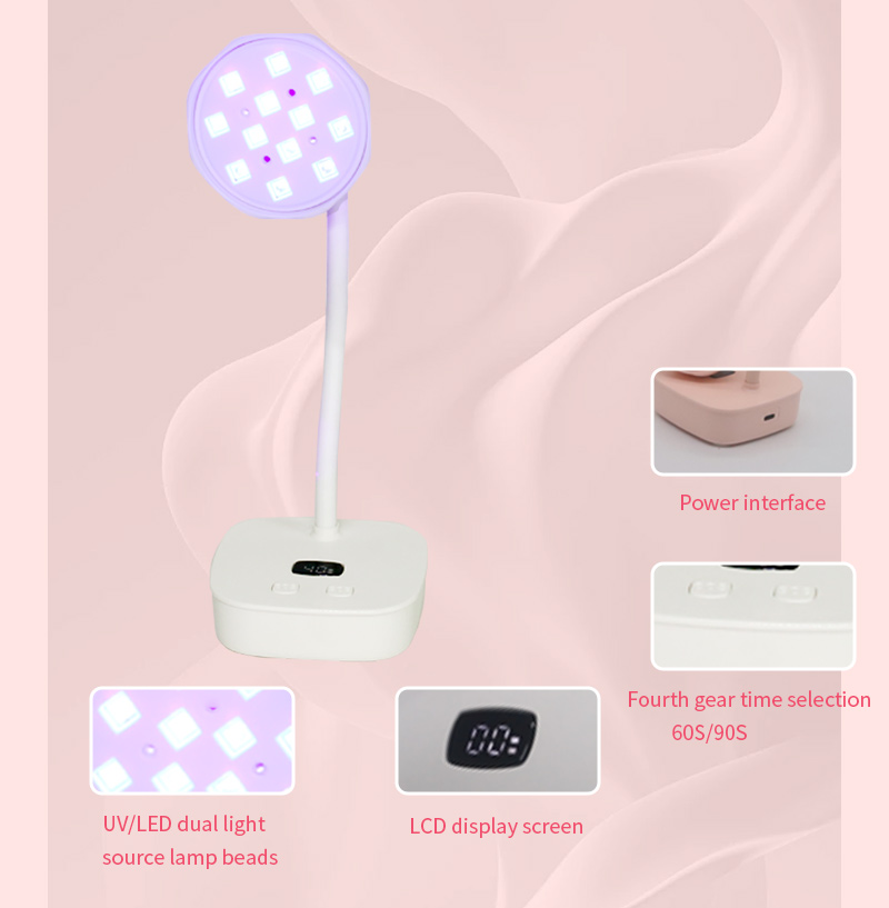 Το προϊόν εξασφαλίζει ομοιόμορφο στέγνωμα κόλλας χωρίς συρρίκνωση. Οι διπλές πηγές φωτός του παρέχουν απαλή θέρμανση για να αποτρέψουν τον αποχρωματισμό των χεριών και την καταπόνηση των ματιών, κατάλληλες τόσο για χέρια όσο και για πόδια, προσφέροντας εξαιρετικά γρήγορα αποτελέσματα στεγνώματος.