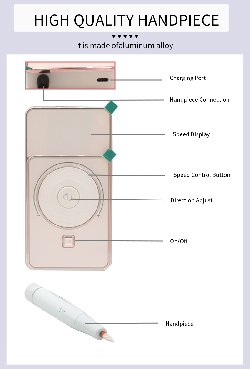 Αυτή η σχεδίαση οθόνης στυλό λείανσης υψηλής ταχύτητας χαμηλού θορύβου, με υποδοχή στυλό λείανσης, οθόνη υγρών κρυστάλλων LCD, μπορεί να δείξει τον αριθμό στροφών/ισχύ/κατεύθυνση, κουμπί διακόπτη ταχύτητας, κουμπί εναλλαγής δεξιόστροφα/αριστερόστροφα, κουμπί παύσης, επαγγελματικός κινητήρας 30.000 rpm, κεφαλή λείανσης με βιδωτό κλείδωμα.