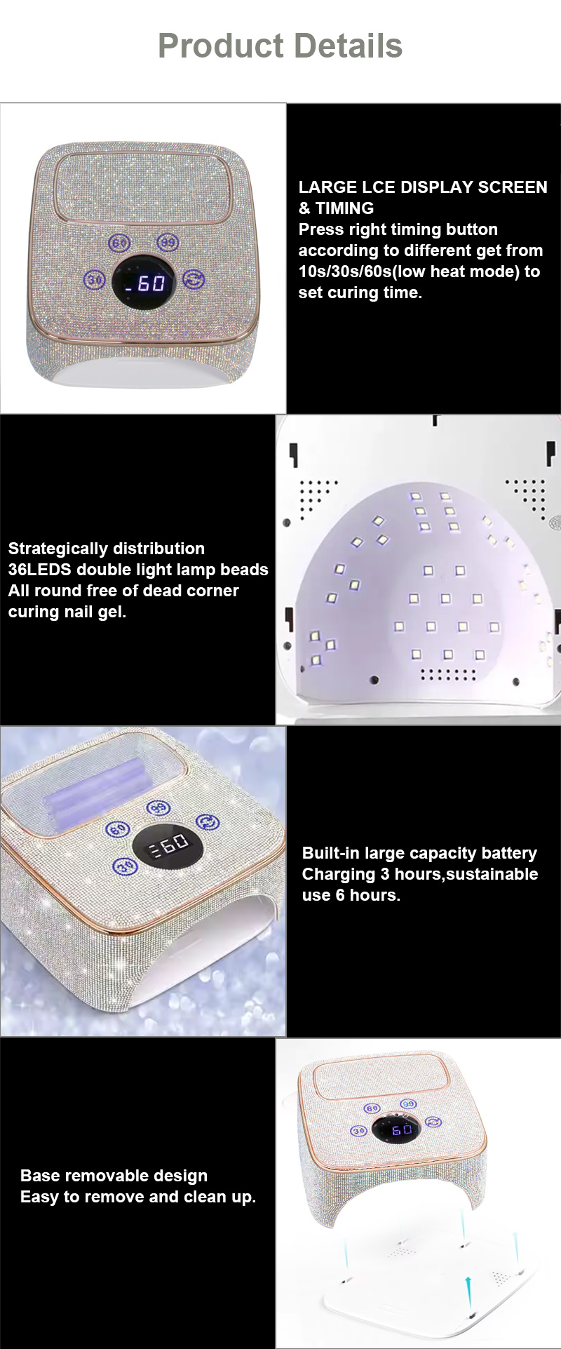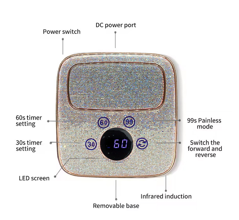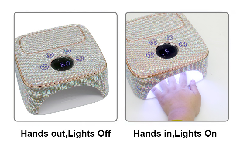 Το προϊόν εξασφαλίζει ομοιόμορφο στέγνωμα κόλλας χωρίς συρρίκνωση. Οι διπλές πηγές φωτός του παρέχουν απαλή θέρμανση για να αποτρέψουν τον αποχρωματισμό των χεριών και την καταπόνηση των ματιών, κατάλληλες τόσο για χέρια όσο και για πόδια, προσφέροντας εξαιρετικά γρήγορα αποτελέσματα στεγνώματος.