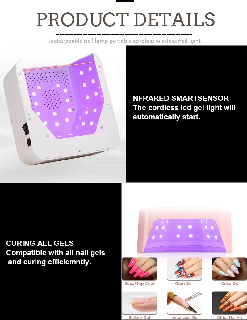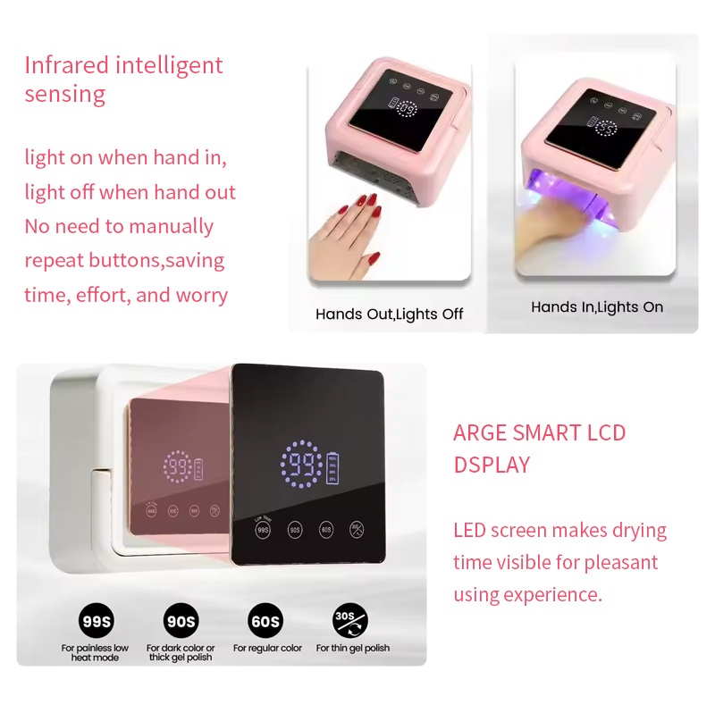 Η τετράγωνη λάμπα στεγνώματος νυχιών διαθέτει τεχνολογία υπέρυθρης έξυπνης ανίχνευσης που ανάβει αυτόματα όταν τα χέρια πλησιάζουν και σβήνει όταν τα χέρια απομακρύνονται—εξαλείφοντας την ταλαιπωρία του επανειλημμένου πατήματος κουμπιών και εξοικονομώντας χρόνο και προσπάθεια. Η κόλλα ψησίματος υψηλής ισχύος δεν απαιτεί μεγάλη αναμονή, εξοικονομώντας χρόνο και προσπάθεια.